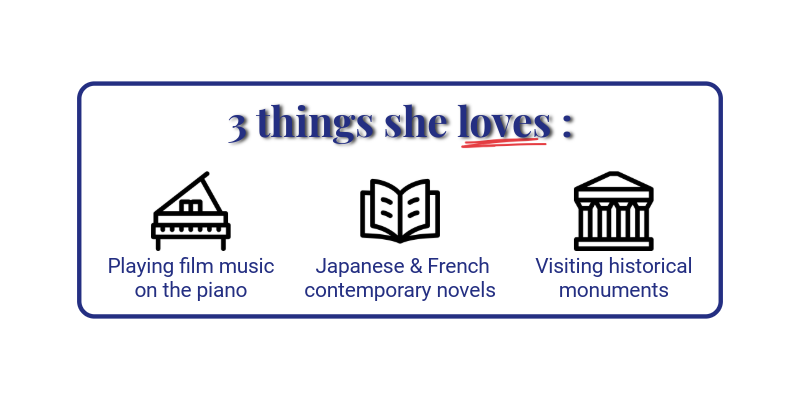 She holds a DALF C2 certification (earned in September 2016) and a Futsuken “DAPF” 1kyu (earned in March 2014), which reflect her deep mastery of the French language.